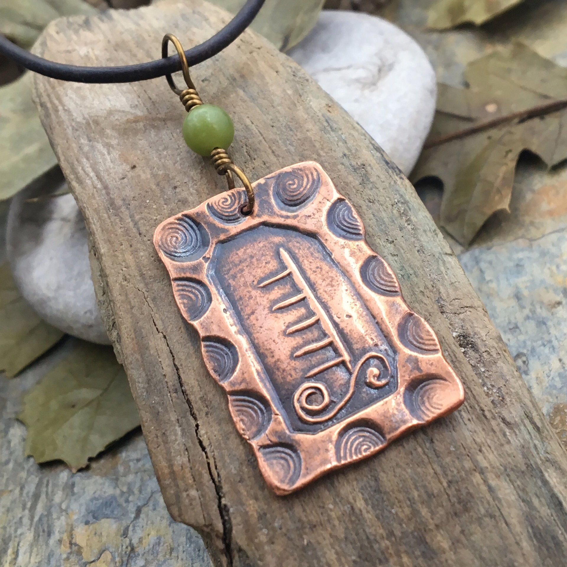 A hand carved Copper pendant of the Celtic Ogham symbol for the Apple Tree.