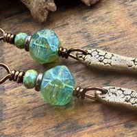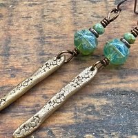 These are my handmade, dangle-drop earrings with a coral fossil texture from rocks found near my home in Door County, WI. Aqua blue/green beads of Czech glass complement the earthy bronze. These arty, earthy earrings hang from hypoallergenic niobium ear wires.