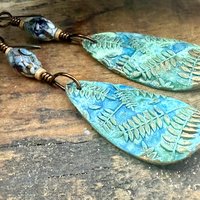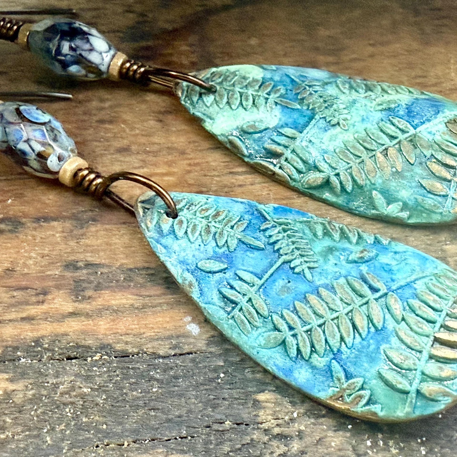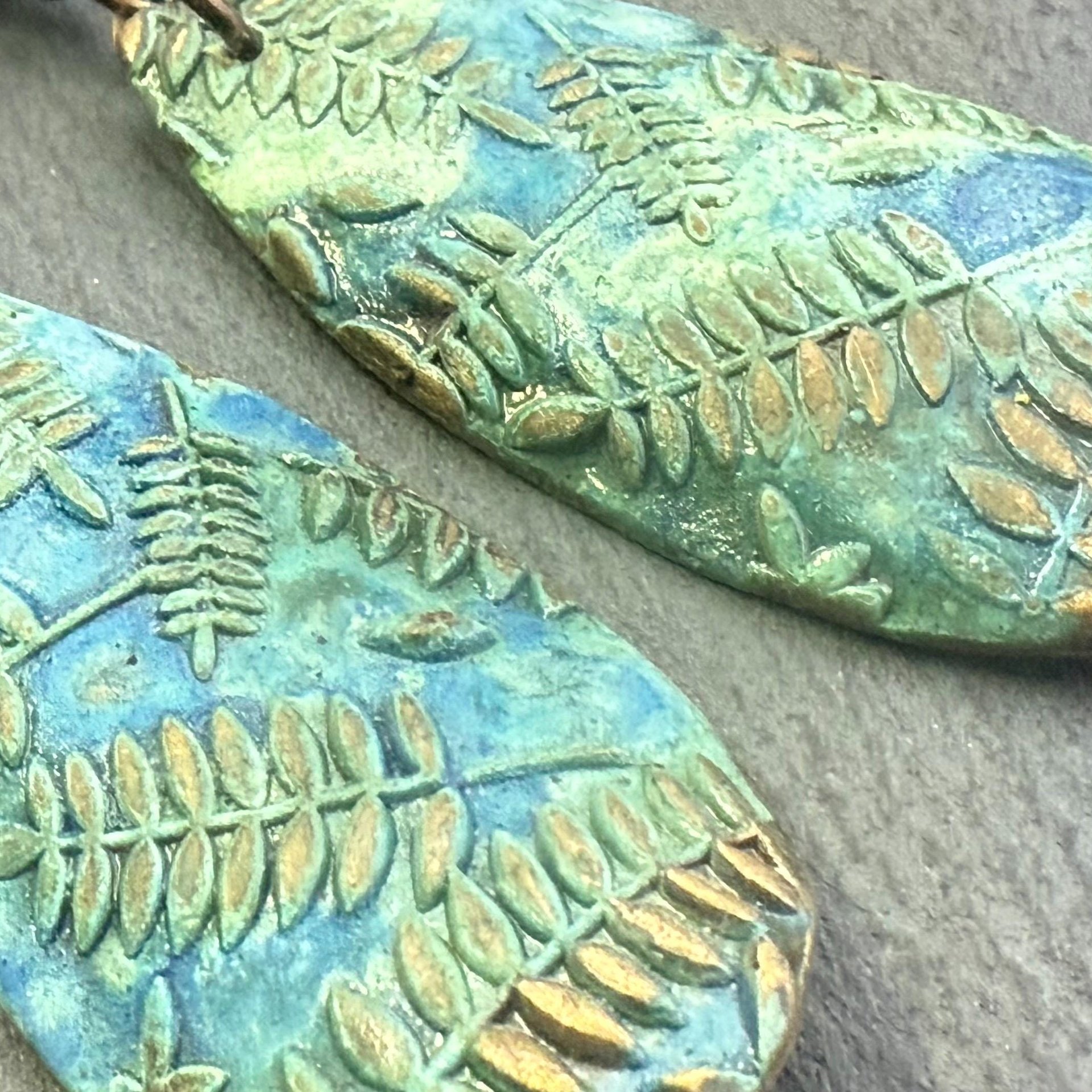 These are my handmade Bronze Fern Earrings with patina colors in aqua blue and sea green, complemented with Czech glass beads. These large shield earrings are dangly and fun, adding a touch of boho, earthy style. These are a bit substantial in weight, larger statement earrings that are sure garner attention!