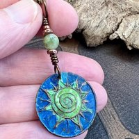 This is my handmade Celtic Sun Spiral pendant in copper with a beautiful mix of colorful aqua blue/green patina. I've added a single bead of Connemara Marble from Ireland to complement the patina colors. My hand-carved spiral design texture is on the backside of this slightly domed pendant, adding interest there as well. This necklace is the perfect touch for your everyday wear.
