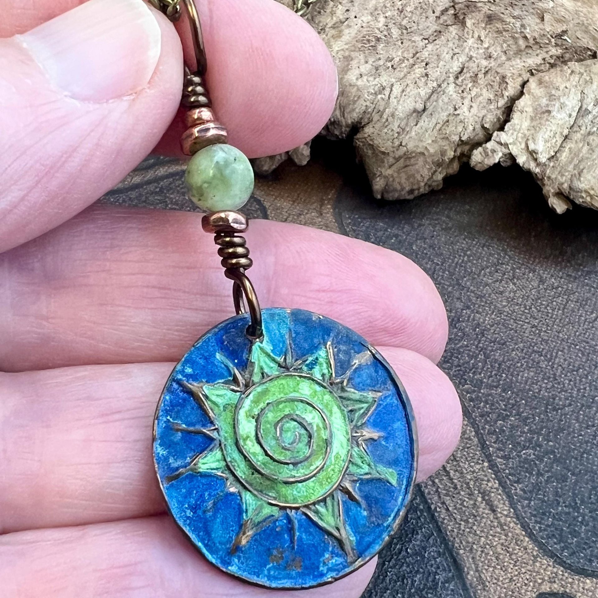 Celtic Sun Spiral Necklace, Copper Patina Pendant, Connemara Marble Bead, Irish Celtic Spirals, Colorful Sun, Pagan Celtic Witch, Handmade