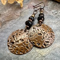 These are my handmade Copper Disc Earrings with earthy metallic and black Czech glass beads. The slightly domed, copper metal discs are just over 1 inch in diameter, they have texture with a very earthy tribal aesthetic, a bit Boho chic style. A great pair of statement earrings!