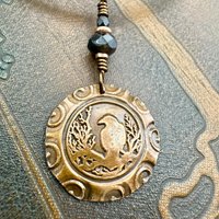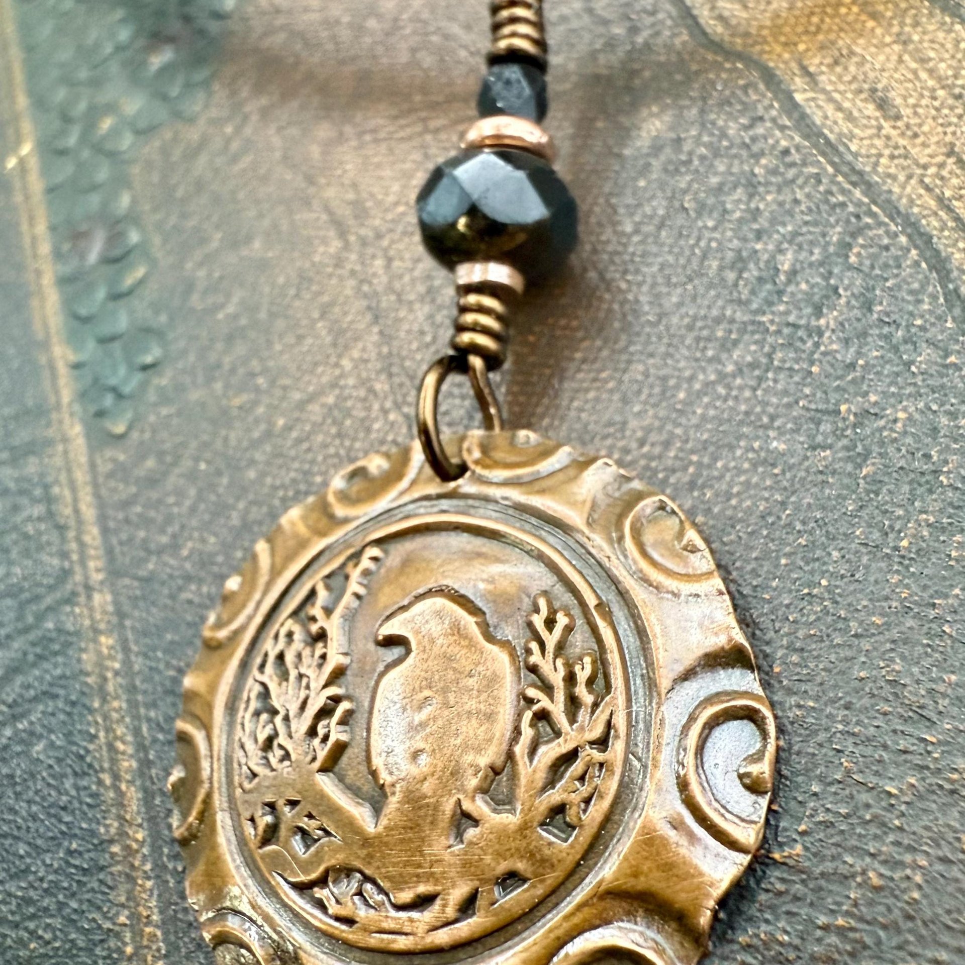 My handmade Raven charm in Copper, created with a traditional wax seal stamp with a spiral border design. Encircled and sitting atop tree branches, this mystical and magical bird watches over you. I've added earthy Czech glass beads in black and copper to complement this mystical and ancient symbol of the Raven. On the back of this slightly domed piece, is my signature spirals design.