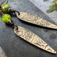 These are my handmade Fern Earrings in Bronze complemented with Czech glass beads in vivid green tones. These teardrop/dagger earrings are light and dangly and adding a touch of earthy botanicals to your style.