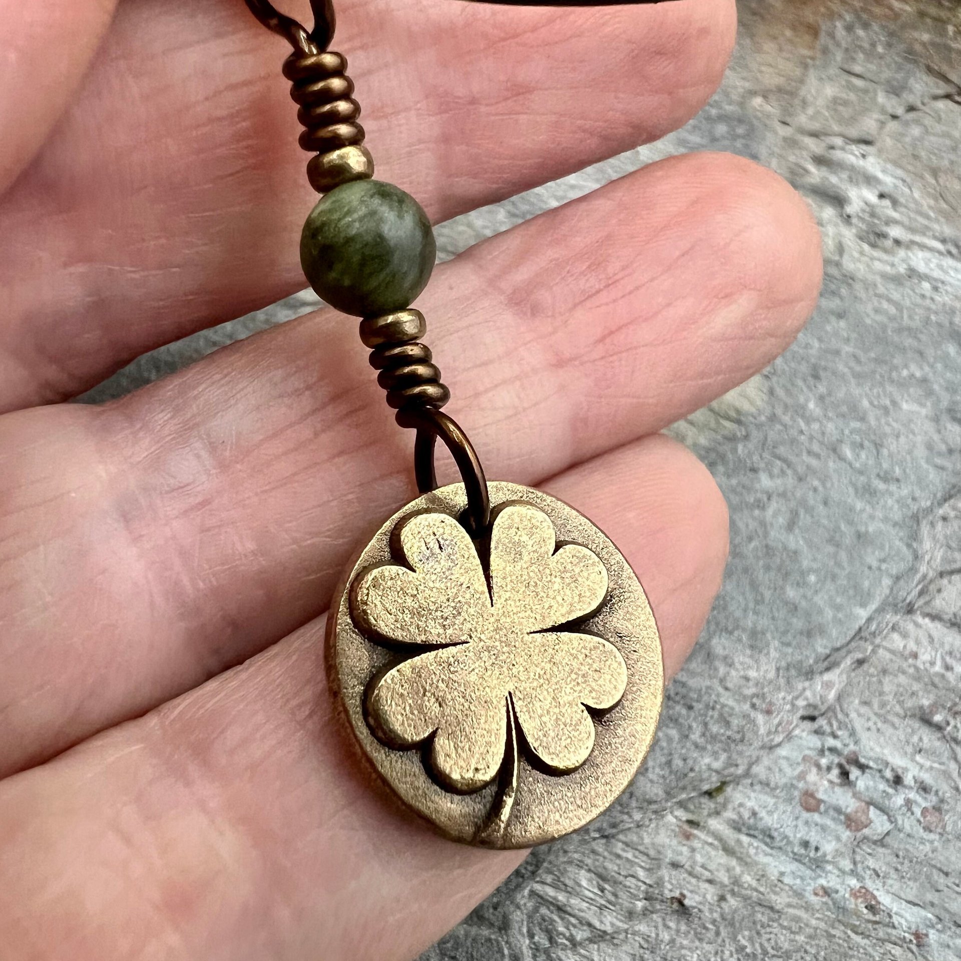Four Leaf Clover, Bronze Necklace, Wax Seal Charm, Connemara Marble, Irish Celtic Jewelry, Lucky Charm, Celtic Witch, Irish Shamrock Luck
