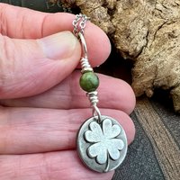 This little 4 Leaf Clover charm in Sterling Silver (.960) was created using a traditional wax seal. The four leaf clover is a symbol of Ireland with the leaves representing hope, faith, love, and luck. The 4 leaves have also symbolized the 4 provinces of Ireland; Connacht (Connaught), Leinster, Munster, and Ulster. I've added a deep green bead of Connemara Marble from Ireland to complement this sweet little charm. My handmade spiral texture adorns the back of this keepsake charm.