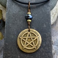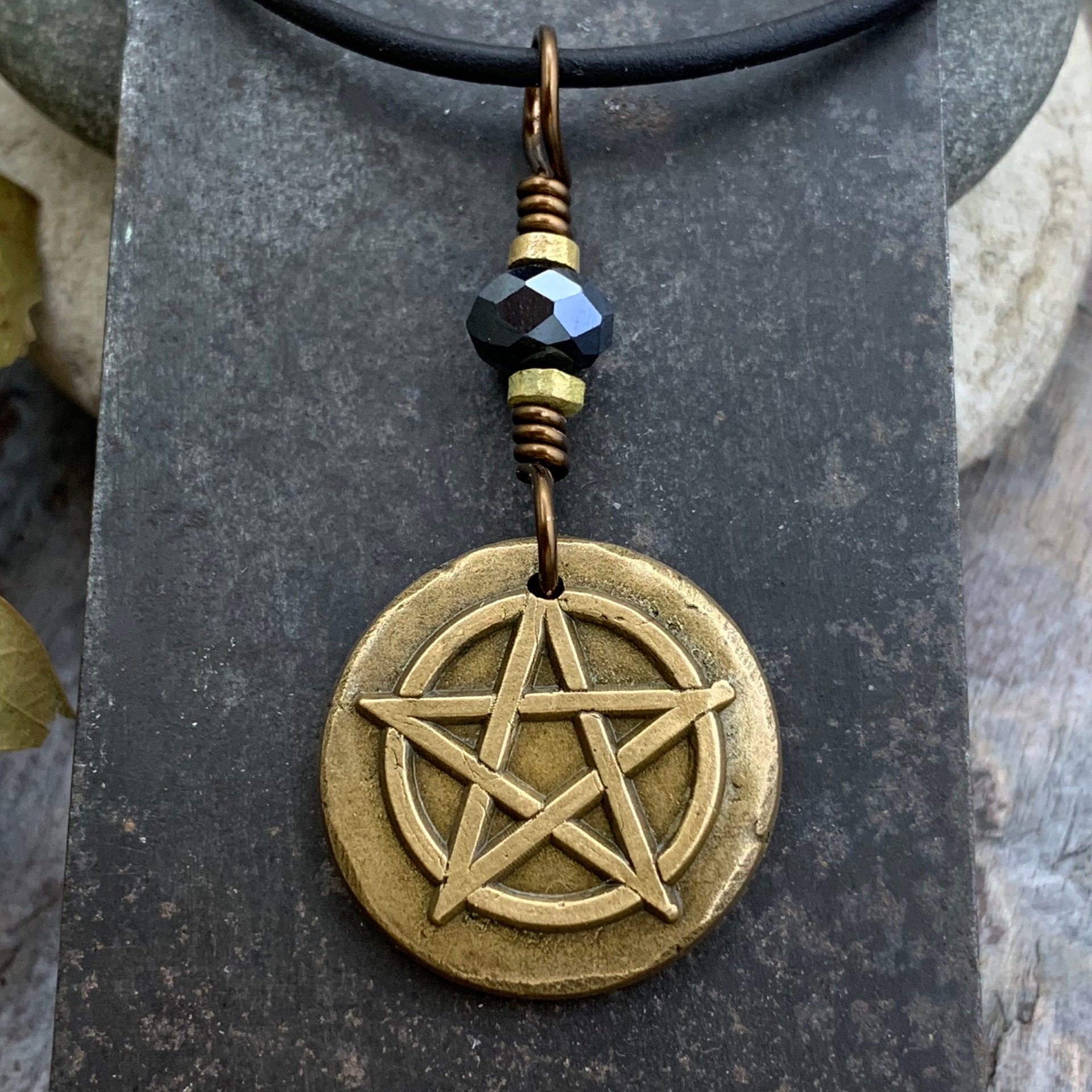 Pentagram Bronze Charm, Pentacle Pendant, Black Crystal Bead, Leather & Vegan Cords, Pagan Wicca, 5 Elements Star, Handmade, Witchy Things