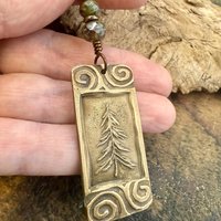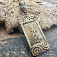 My handmade Pine Tree pendant in bronze with spiral borders symbolizing the soaring heavens above and the earth and underworld below, the spirals swirl into the heavens and deep into the roots. I've added earthy green/brown beads of Czech glass, complementing the pine tree design so perfectly. The design on the back is my own adaptation of Cup and Ring marks and spirals found carved in stones in Ireland, Scotland, and other parts of Europe.