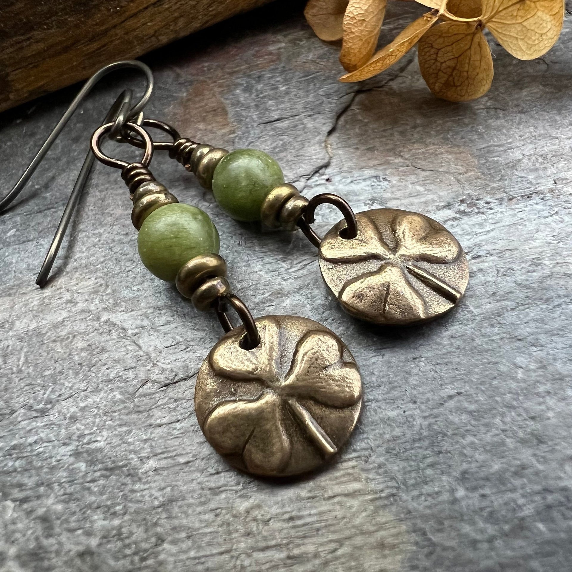 Handmade bronze Shamrock/Clover earrings with beautiful beads of deep green Connemara marble from Ireland. The ear wires are hypoallergenic niobium wire, safer for those with metal sensitivities. I've added texture to the back side of these tiny disc earrings, brining interest to this side too.
