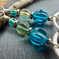 These are my handmade sterling silver, drop hoop earrings with beautiful mixed Czech Glass beads. A light pair of earrings with a splash of sky and aqua blues to complement the silver, a great pair of every day earrings.